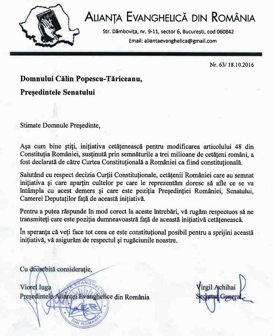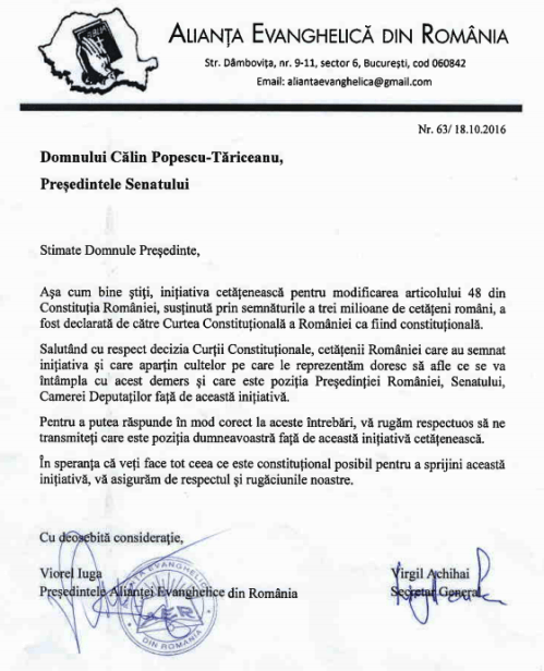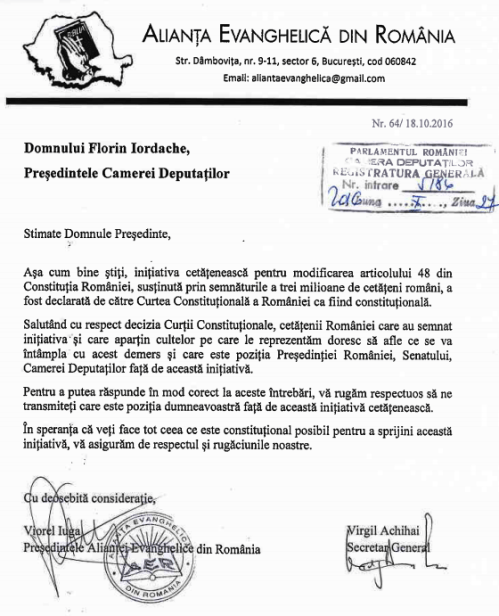 Mesajul Alianței Evanghelice – lumina și sare pentru România By barzilaiendan on October 27, 2016 • ( 0 ) † Adresele transmise de către Alianţa Evanghelică din România Camerei Deputaţilor şi Senatului României Share this: Click to share on X (Opens in new window) X Click to share on Facebook (Opens in new window) Facebook More Click to email a link to a friend (Opens in new window) Email Click to print (Opens in new window) Print Like Loading...‹ Bill O’Reilly’s Epic Response To Hillary’s Lies Will Change The Outcome Of The Election. Oh My.O constatare corectă ›Categories: Articole de interes general Related Articles Adevărul este mereu la modă Nu degeaba se spune: iarnă rusească Pe suportul crucii Profeții geopolitice – Dan Dungaciu, p. Teologos