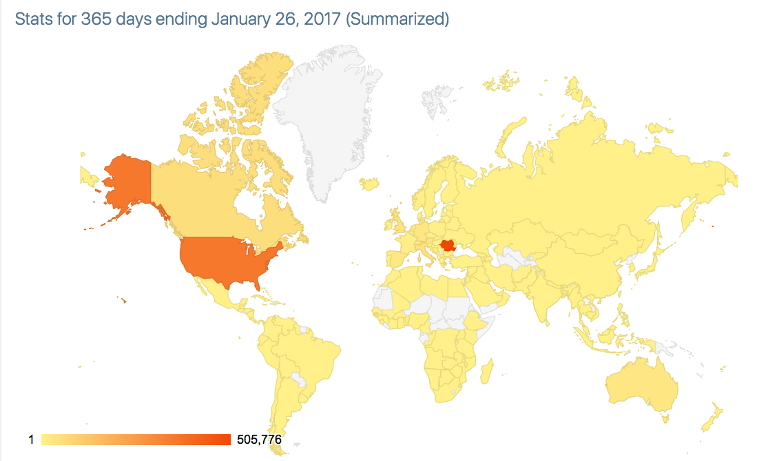 Statistică pe țări: "Romania",505778 "United States",358116 "Canada",52087 "Italy",47308 "United Kingdom",39634 "Austria",28937 "Germany",27580 "Australia",25770 "Spain",22334 "Moldova",18703 "France",8340 "Belgium",7135 "Greece",3758 "Ireland",3742 "Switzerland",3725 "Poland",3524 "Norway",3328 "Sweden",2813 "European Union",2392 "Israel",2391 "Netherlands",1715 "Ukraine",1452 "Hungary",1311 "Denmark",868 "Czech Republic",536 "Portugal",398 "Russia",354 "New Zealand",327 "United Arab Emirates",325 "India",315 "Turkey",240 "Cyprus",220 "Mexico",218 "South Korea",208 "Bulgaria",176 "Luxembourg",167 "Serbia",149 "Brazil",141 "Thailand",117 "Finland",107 "Algeria",102 "South Africa",92 "Croatia",89 "Singapore",88 "Slovakia",86 "Dominican Republic",78 "Indonesia",72 "Vietnam",69 "Kenya",69 "Nigeria",55 "Cambodia",55 "Philippines",53 "Albania",52 "Slovenia",51 "Morocco",49 "Macedonia",42 "Qatar",42 "Japan",41 "Guernsey",39 "Jamaica",37 "Malaysia",36 "Saudi Arabia",33 "Peru",30 "Malta",26 "Palestinian Territories",24 "Madagascar",22 "Mongolia",22 "Namibia",21 "Hong Kong SAR China",21 "Colombia",19 "Cuba",19 "Georgia",18 "Argentina",18 "Lithuania",18 "Malawi",18 "Pakistan",16 "Lebanon",16 "Bangladesh",15 "China",15 "Jordan",15 "Taiwan",15 "Nepal",14 "Estonia",14 "Kuwait",14 "Chile",12 "Sri Lanka",12 "Zambia",12 "Egypt",12 "Tanzania",11 "Cayman Islands",11 "Zimbabwe",10 "Honduras",10 "Faroe Islands",9 "Fiji",9 "Côte d'Ivoire",9 "Jersey",8 "Costa Rica",8 "Uganda",8 "Kazakhstan",7 "Réunion",7 "Ecuador",7 "Montenegro",7 "Andorra",7 "Curaçao",6 "Oman",6 "Bahamas",6 "Rwanda",6 "Bosnia & Herzegovina",5 "Trinidad & Tobago",5 "Bolivia",5 "Seychelles",5 "Iran",5 "Armenia",4 "Cameroon",4 "Iceland",4 "Latvia",4 "Kyrgyzstan",4 "Panama",4 "Myanmar (Burma)",4 "Senegal",4 "Mozambique",4 "Ghana",3 "Benin",3 "Belarus",3 "Syria",3 "Congo - Kinshasa",3 "Guatemala",3 "Sierra Leone",3 "Iraq",3 "Congo - Brazzaville",3 "Gibraltar",3 "Guinea-Bissau",3 "Uruguay",3 "Macau SAR China",3 "Guinea",2 "Martinique",2 "British Virgin Islands",2 "Venezuela",2 "San Marino",2 "Libya",2 "Puerto Rico",2 "Angola",2 "Aruba",2 "Tunisia",2 "French Guiana",2 "Bhutan",2 "Mauritius",2 "Azerbaijan",2 "Bermuda",2 "Guyana",2 "Isle of Man",2 "Burkina Faso",1 "Botswana",1 "Maldives",1 "Åland Islands",1 "Guadeloupe",1 "U.S. Virgin Islands",1 "Togo",1 "Guam",1 "Dominica",1 "Bahrain",1 "Liechtenstein",1 "Grenada",1 "Ethiopia",1 "Nicaragua",1 "Vatican City",1 "Mali",1 "Afghanistan",1