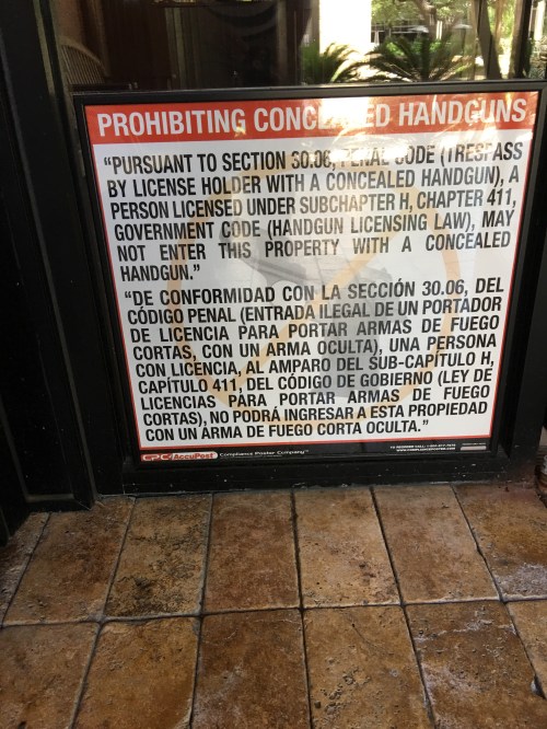 Da, sunt unele magazine sau restaurante care nu agreaza sa porti arma la vedere. Si este legal sa ceri asta clientilor tai in Texas. De asemenea, sunt alte magazine si restaurante care incurajeaza portul de arma la vedere. Iarasi este legal sa faci asta. In consecinta, daca patronul institutiei sau al localului iti solicita sa te aliniezi cu politica sa privitoare la portul de arma la vedere, repet: la vedere… conform legii ai obligatia sa te conformezi daca doresti sa intri sau sa folosesti serviciile respective.