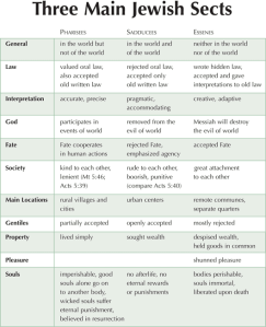 The New Testament mentions several Jewish social institutions that can be quite confusing. The charts in this section provide basic information about the main groups with which Jesus interacted or may have had contact. Beyond the aristocratic Herodians, three main Jewish sects were religiously active during the time of Jesus: Pharisees, Sadducees, and Essenes. In addition, many Jews would have been unaffiliated with any of these particular movements.