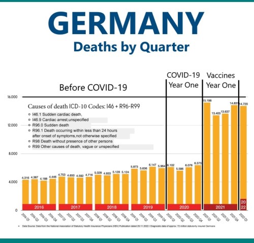 by WorldTribune Staff, June 13, 2023 A chart from Germany’s National Association of Statutory Health Insurance (KBV) that breaks down deaths by quarter from 2016 to the first quarter of 2022 …
